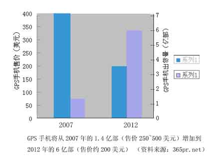 ABI Research预期,未来5年GPS手机将获得强劲增长,将从2007年的1.4亿部左右增加到2012年的6亿部以上。除了主要供货商,如Nokia、Motorola、RIM、Samsung外,亚洲的一些小型厂商如HTC、Quanta、Inventec也开始涉足GPS设备。