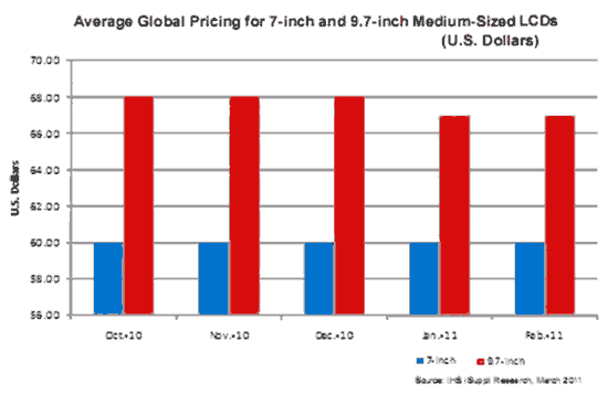 【产通社,3月25日讯】据IHS iSuppli公司的研究,苹果iPad等媒体平板热销,刺激了市场对7.0英寸和9.7英寸液晶显示器(LCD)的需求不断增长,在最近五个月帮助这类面板价格止住或者减慢了跌势,分别保持在60和67美元左右。
