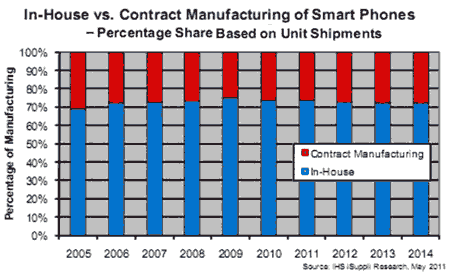 自有品牌智能手机OEM厂商,如苹果和Research in Motion (RIM),目前仅利用合同制造商提供EMS服务。RIM和苹果2010年出货量与市场份额都取得增长,利益于合同制造商的支持。但是,虽然为这两家OEM厂商提供服务的EMS提供商营业收入与利润最近两年都大幅增长,但未来EMS提供商不一定能继续获得这种好处。而苹果作为设计大家,将来不太可能去找以前没有在iPhone等产品上合作过的新的合同制造商。同时,RIM公司的BlackBerry成长前景具有不确定性,能否成功取决于它如何与越来越流行的iPhone和Android智能手机竞争。如果RIM公司的出货量开始停滞或下滑,将对伟创力等EMS提供商带来不利影响。