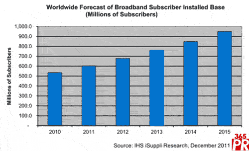 【产通社,12月15日讯】由于对互联网接入的需求不断增长,尤其是来自中国等发展中地区的需求,未来几年全球宽带用户预计增长75%以上,2010-2015年新增用户将达到4.15亿个。据IHS iSuppli公司的宽带与数字连接家庭市场追踪报告,到2015年,全球宽带用户将达到9.486亿个,而2010年是5.333亿个。今年宽带用户将达到6.002亿个,比2010年增长12.5%。