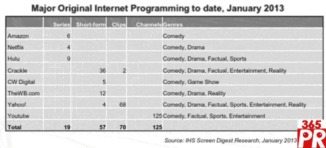 截止到2013年1月末,八家美国主要互联网平台一共制作了271个短片、系列节目、短系列节目与频道,这就是原创互联网节目的大概规模。在这个总数中,包括19个原创系列节目、57个短系列节目、125个频道和70个短片。这些节目都由各自的平台制作和提供资金,这使其有别于个人制作上传的众多网络视频。