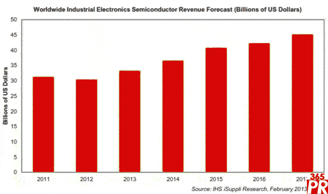 2012年工业电子半导体营业收入为305亿美元,比2011年的314亿美元减少2.8%。这证实了当初增长疲弱的预测,同时亦凸显该市场的下滑程度是多么惊人——2010年大增36.5%,而2011年亦强劲增长9.7%。但随着需求增强和预计下半年有所复苏,2013年前景将会改善。预计随后几年市场会继续扩张,2011-2017年的复合年度增长率为6.3%。到2017年,营业收入将达到453亿美元左右。