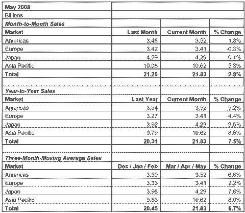 SIA主席George Scalise认为5月成长率“相当良好”,并引述消费电子产品的持续销售强度为证。他表示除获得退税支票刺激的美国之外,中国、拉丁美洲与印度等新兴市场的消费电子产品需求均有增长。