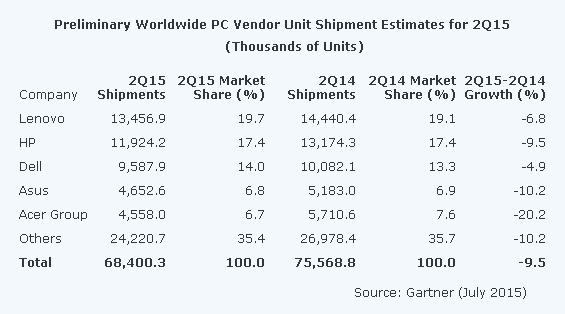 【产通社,7月13日讯】Gartner预计,2015年第二季度全球PC销量只有6840万台,相较2014年同期大幅下降了9.5%。不过,Gartner认为这次下降只是临时事件,PC市场的结构并未发生变化。因此,经过一轮下降后,全球PC市场将在2016年重回缓慢、稳定上升阶段。