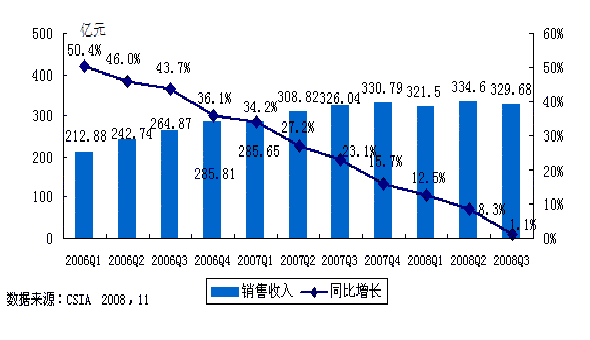 【产通社,11月27日讯】2008年前三季度,中国集成电路产业受国际市场疲软、市场环境变化和部分重点企业业务调整的影响,发展速度呈现逐季放缓的走势。世界金融危机对实体经济的影响逐步显现,全球集成电路产业第三季度只有约2%的缓慢增长。